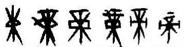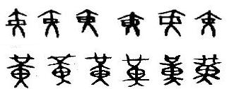 “黄“字也是有点奥妙的;甲骨文中有两个写法,一个上面是个箭头,一个是草头。从它同“帝”的类似可看到它也是表述一个用草捆绑做成的像。上有箭头是因为这种像用来做射箭的靶子,因为靶子涂成黄色,这个字后来被假借来描述颜色,再后来其他的意义被遗忘了。