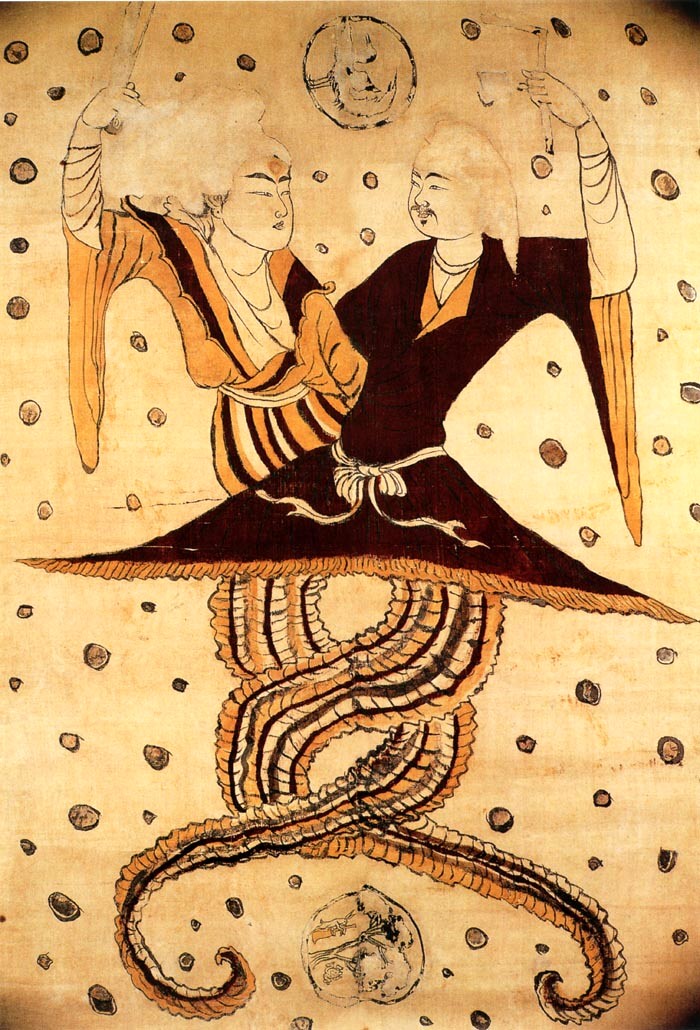值得指出的是“风“繁体字是“虫”取代 x。“虫”的古义是蛇,象形眼镜蛇正面站立的姿势。伏羲女娲族,又称太昊族,是崇蛇的,所以常有半人半蛇的双人图(下图是唐代的,来自新疆,可见伏羲女娲传说分布极广)