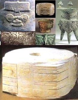 80年代发现红山遗迹差不多时候,考古团也在江南太湖一带发现更多,更大规模的新石器时代古墓,称为良渚文化.左图是出土的大型琮王,刻有良渚特有的神人图案和鸟纹。大约四千年前良渚文化消失不知去向,极可能是因洪水被逼西迁.由东夷地区西去投奔尧族的舜就可能是其中一部分。良渚神人戴羽冠,正是以前说过的有虞氏鸟族族主装饰;而这又同刑天有关,因为同是以乳为目以脐为口。