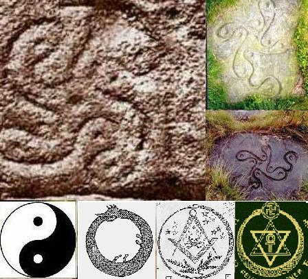 太极图是道家的符号,和佛教的万字纹(卍 - 也是西藏苯教徒和古代羌人的族徽)同出于极古远的巫术符号:即是两条纠缠的蛇。右面有几幅欧洲各地的古老石刻,便是远古万字蛇纹。黑中一点白白中一点黑,其实原是蛇的眼睛。两蛇相交是在交配,古老的崇蛇族以此作为生息繁殖的代号,而生殖又同鱼猎农业丰收拉上了关系,因而符号象征着崇蛇族的基本生存因素